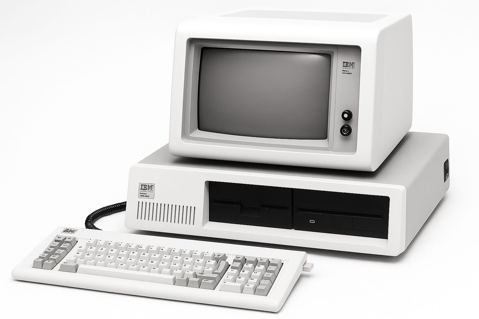 What they ended up with was an unexciting but solid machine, based around Intel’s 8088 microprocessor3. The base model cost $1,5654 (approximately $5,500 in 2025) and included a system unit, keyboard, and color graphics card. Users could set it up as a home computer using cassette tapes for storage and a television as the display. Most buyers were looking for a business machine with a monitor, disk drive, more memory, and software; options that quickly raised the price to around $3,000.